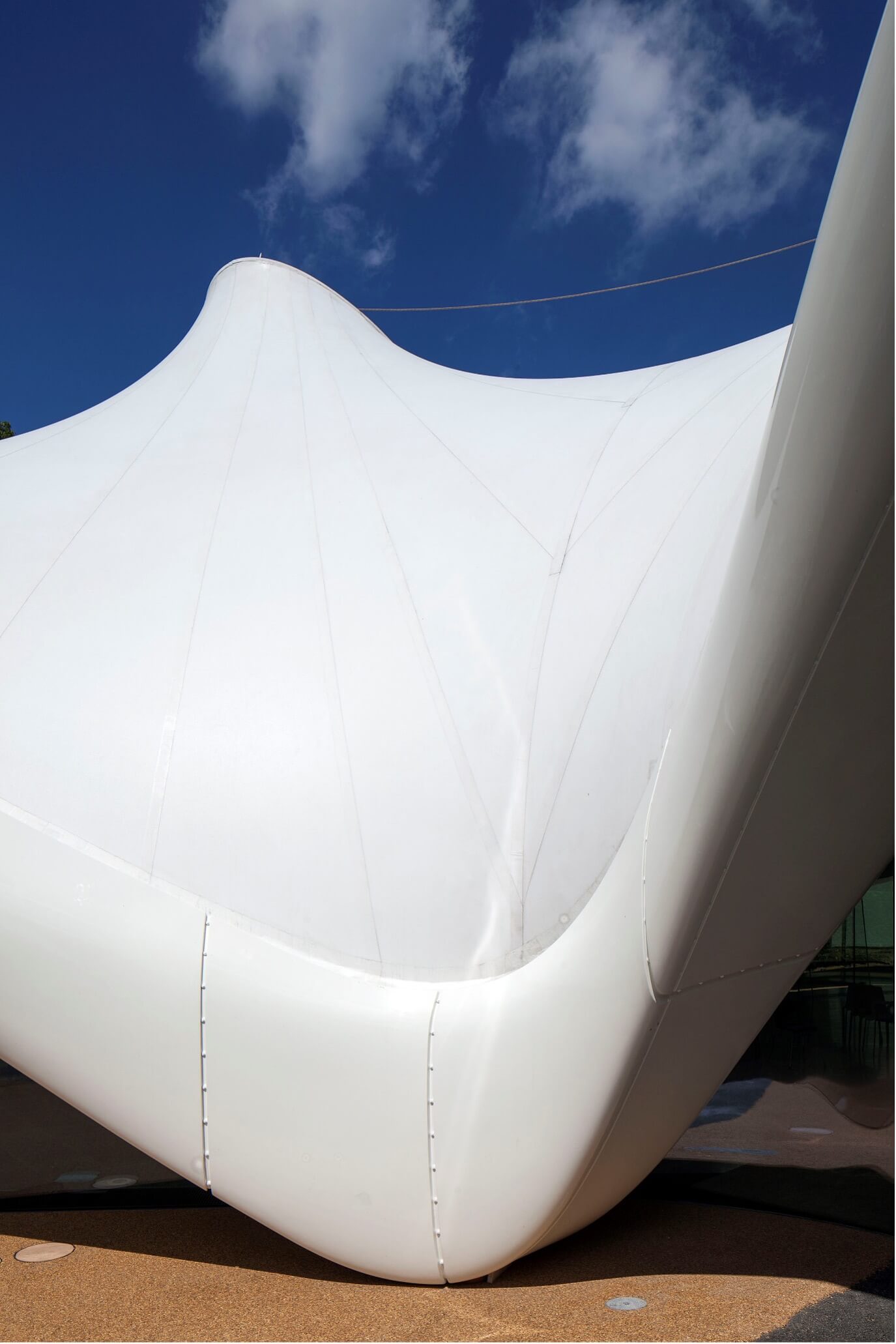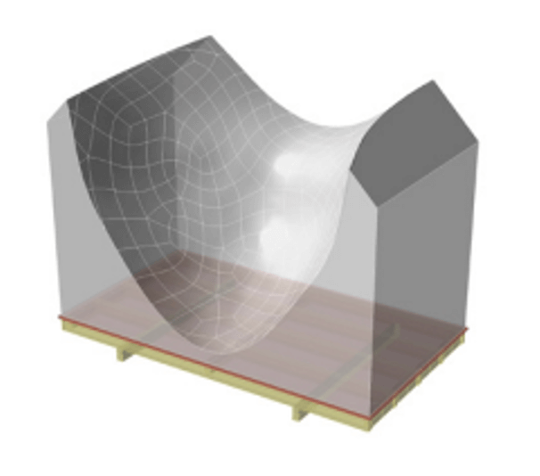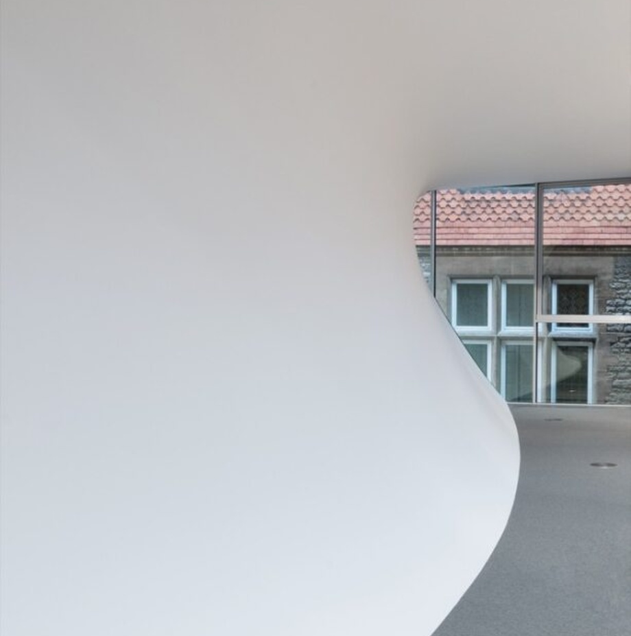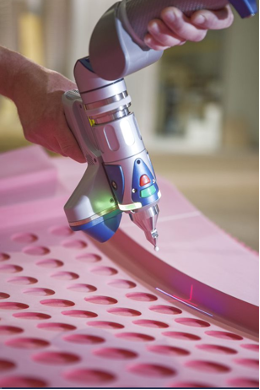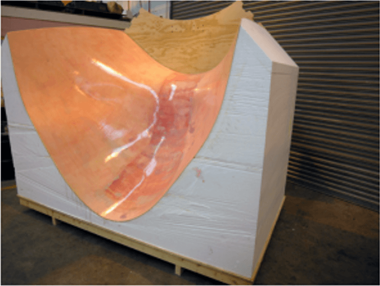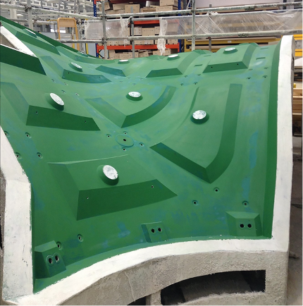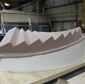 An accurately machined pattern was produced on a 5-axis router from EPS coated in epoxy tooling paste. The pattern included machined screed rails on both sides to precisely set the line of the curved stair soffit. A direct GRP mould was taken from the pattern and reinforced with plywood stiffeners. These were fitted closely behind the casting faces and were cut to a level datum so that once the mould was placed casting face up, they would act as a flat support table. Removable edges allowed for fast and efficient extraction of the cured concrete units.