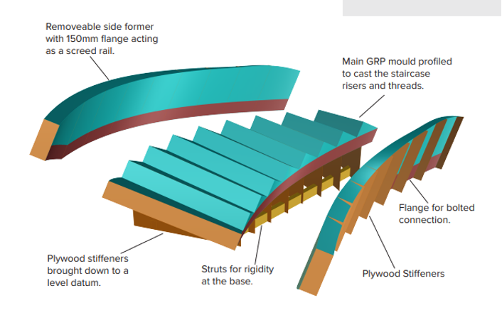 4 no unique GRP moulds that successfully pre-cast 100no flights of stairs to the required dimensional accuracy and quality.